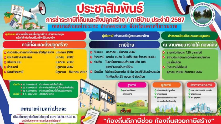 ประชาสัมพันธ์การชำระภาษีที่ดินและสิ่งปลูกสร้าง/ภาษีป้ายประจำปี 2567 3 มกราคม 256710 มิถุนายน 2024 เทศบาล ตำบลท่าประจะ-03 ข่าวประชาสัมพันธ์ FacebookFacebookXXLINELine เทศบาล ตำบลท่าประจะ-03